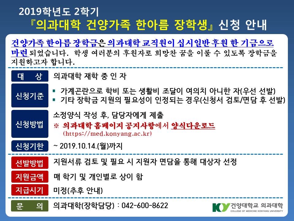 | 제목 | 2019학년도 2학기 「의과대학 건양가족 한아름 장학생」 신청안내 | ||||