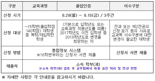 2023학년도 2학기 교육과정/졸업인증 적용년도 및 교과목 이수구분 변경 신청에 대하여 다음과 같이 안내하오니, 필요한 학생은 안내문을 숙지한 후 신청서를 작성하여 제출해 주시기 바랍니다.