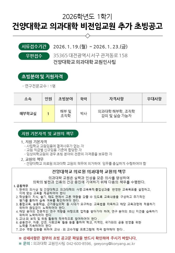 | 제목 | 2026학년도 1학기 건양대학교 의과대학 비전임교원 추가 초빙공고 | ||||