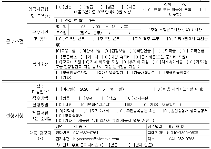 가. 구인사항 -모집직종: 경리 및 관리 -직무내용: 경리회계 및 일반관리 -고용형태: 정규직 -우대조건: 문서작성 우수자, 회계전공자 나. 근로조건 및 전형사항