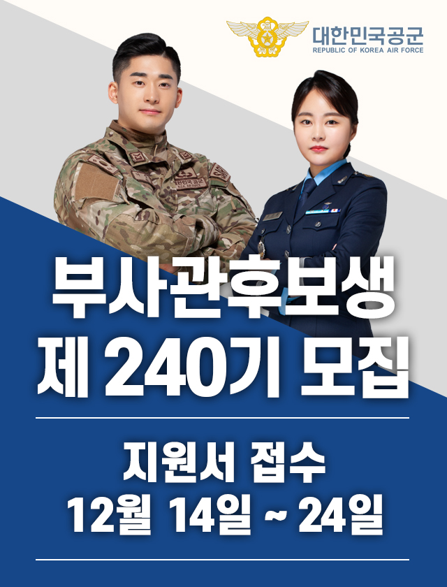 [제 240기 부사관 후보생 모집] 대한민국을 지키는 가장 높은 힘! 공군 제240기 부사관후보생 모집 · 지원서 접수 : ’20. 12. 14.(월) ~ 12. 24.(목) · 지원문의 - 공군모집 홈페이지 : http://go.airforce.mil.kr:8081 - 공군모집 안내전화 : 1433-09(공군)
