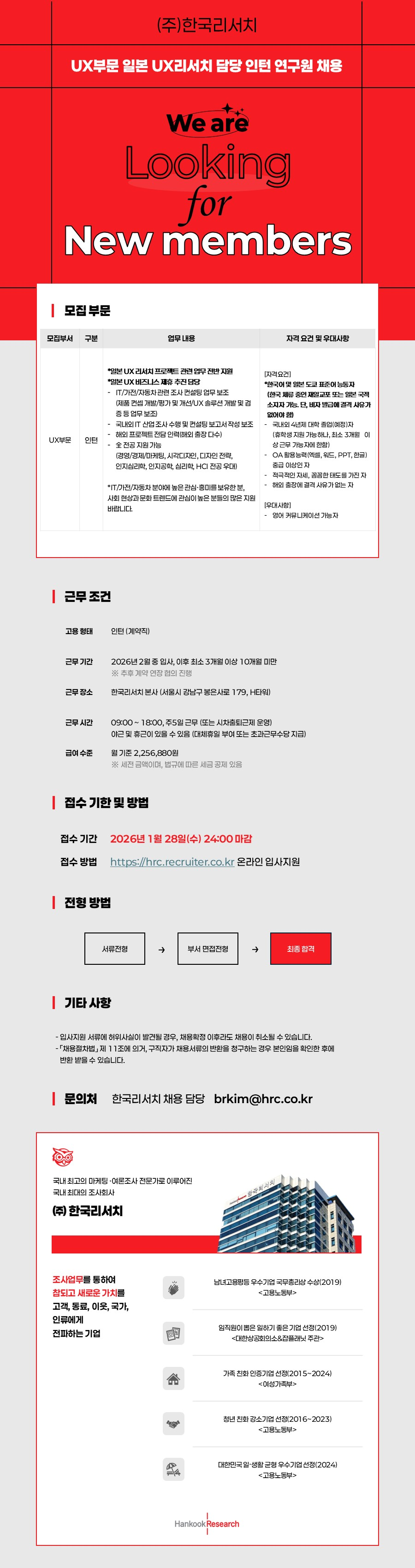| 제목 | [한국리서치]UX부문 일본 UX리서치 담당 인턴 연구원 채용(~1/28) | ||||